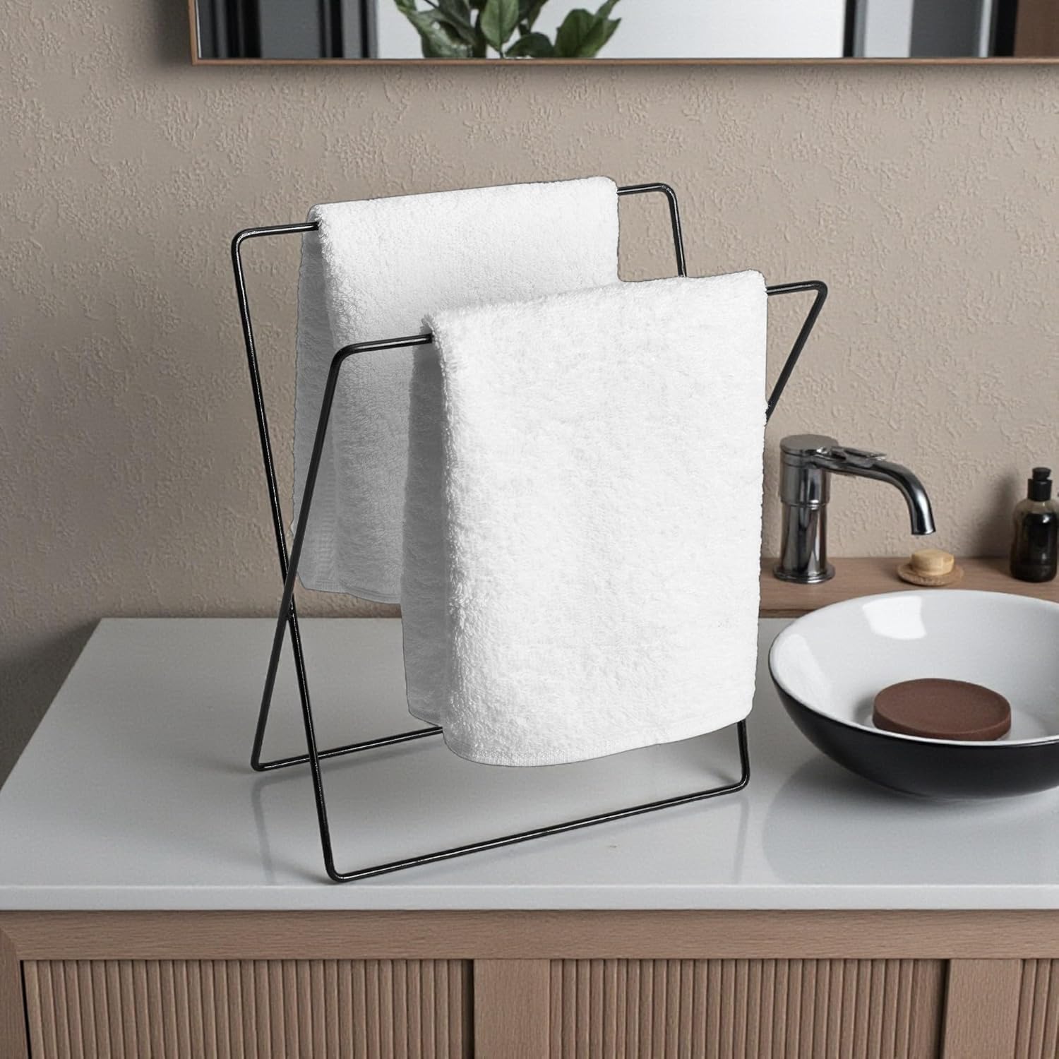 Keep your space neat and stylish with this two-tier freestanding towel holder. Made from durable, rust-resistant metal with a sleek black finish, it offers convenient, no-installation storage for hand towels in bathrooms or kitchens.