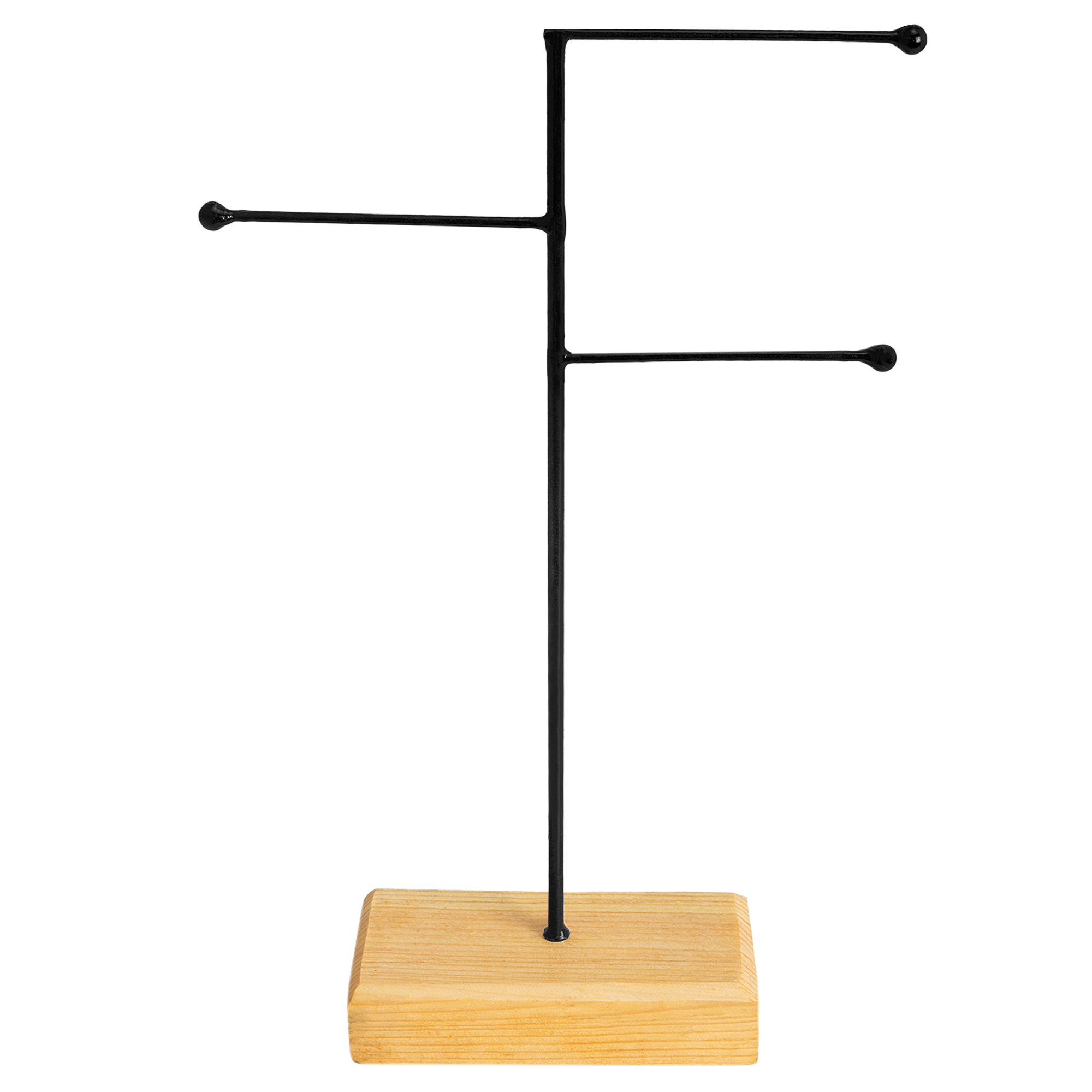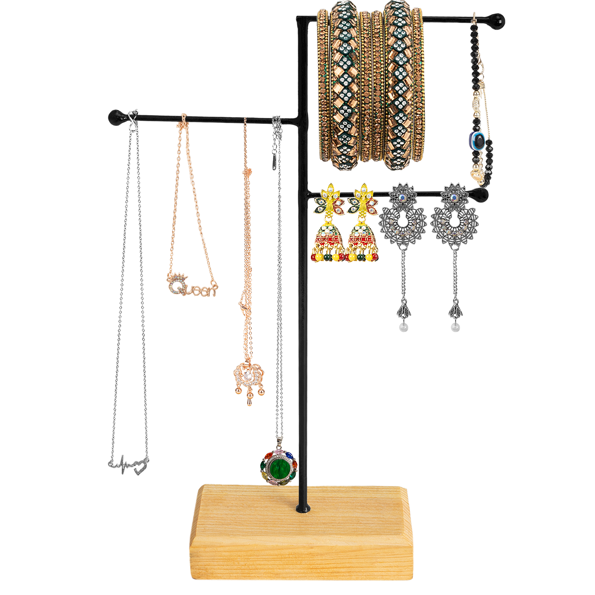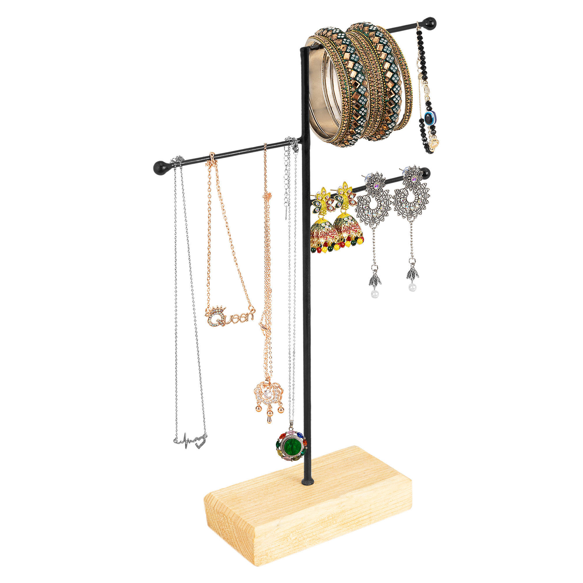 This stylish jewelry stand, made from durable metal with a wooden base, provides a clutter-free way to display and organize your earrings and chains.