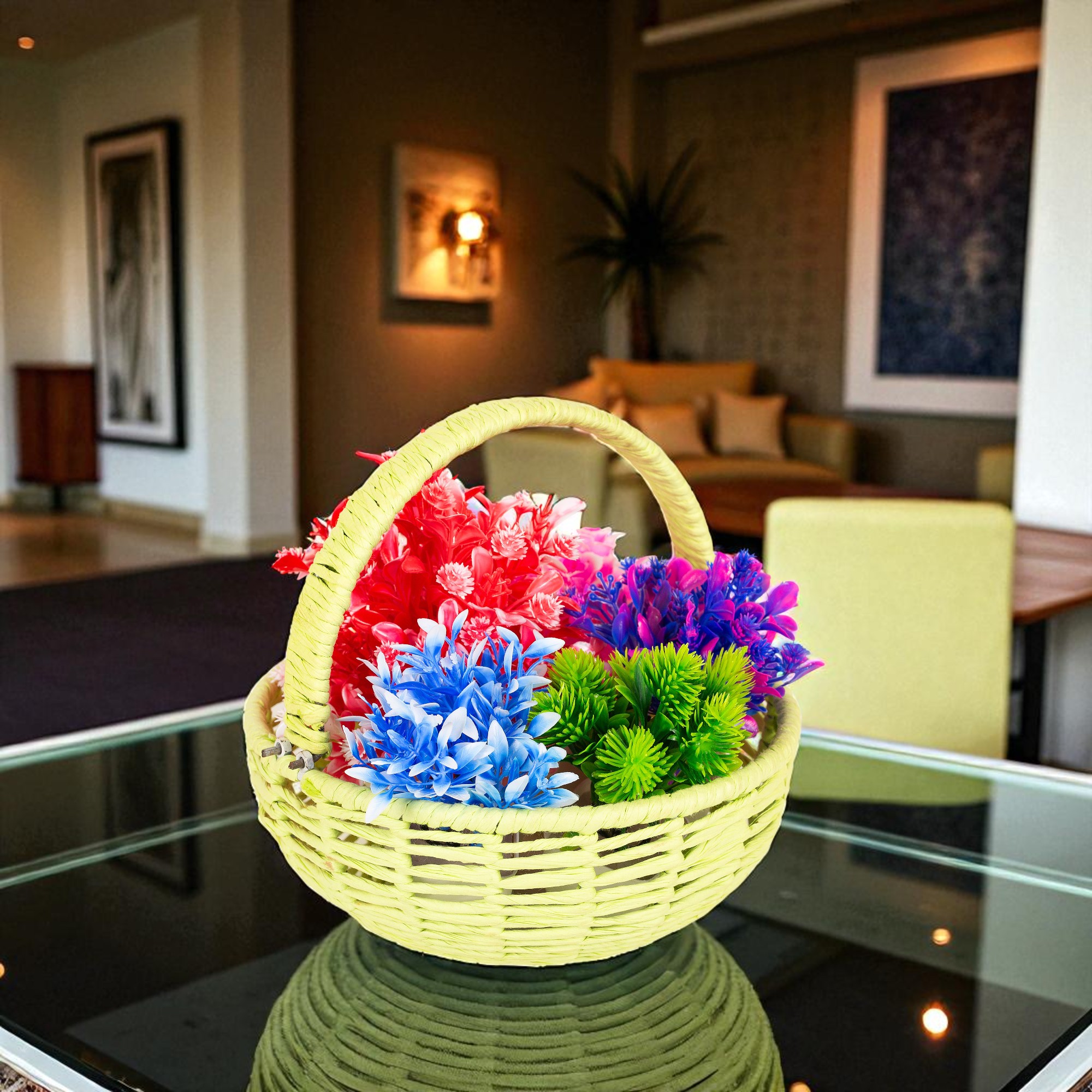 Bring home a touch of handmade charm with this raffia-wrapped basket, proudly made in India by skilled artisans. Its strong metal base and easy-to-use detachable handle make it great for fruits, pooja, gifting, or flower arrangements.