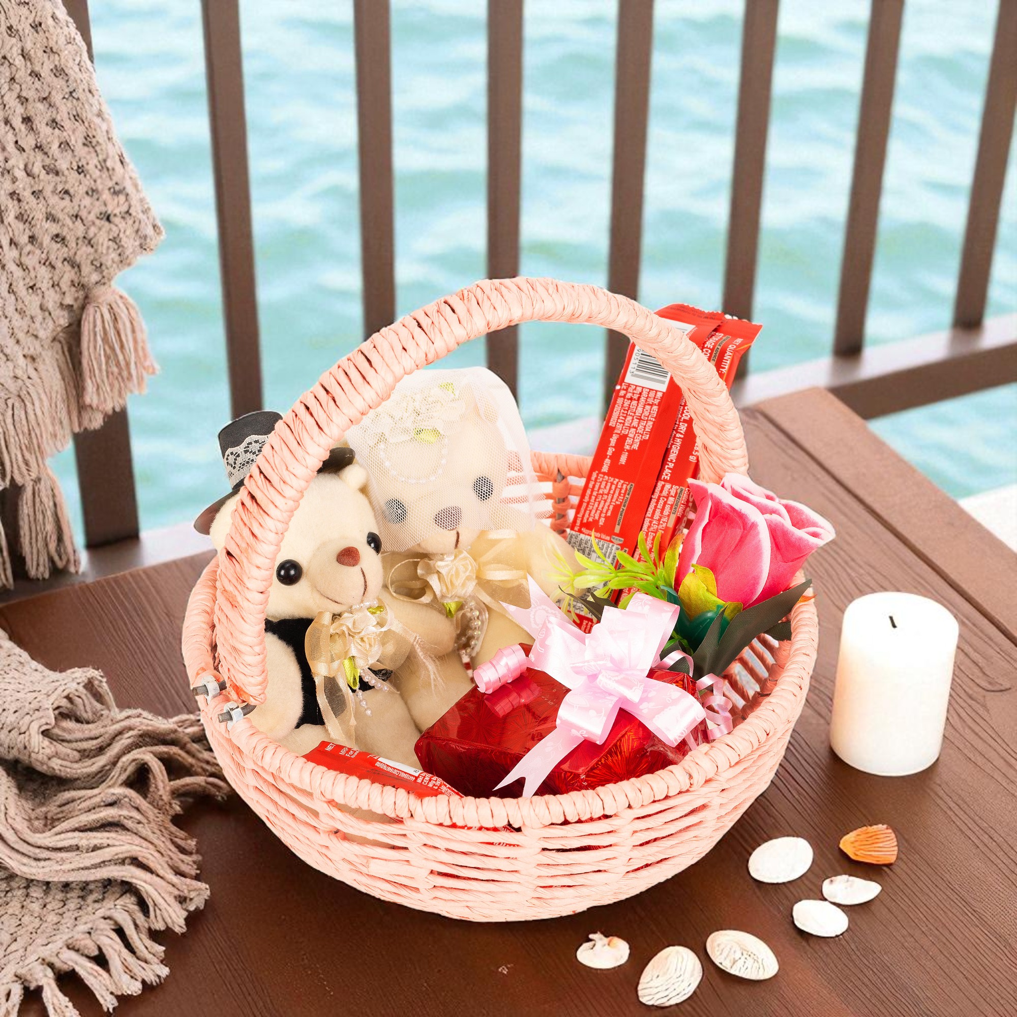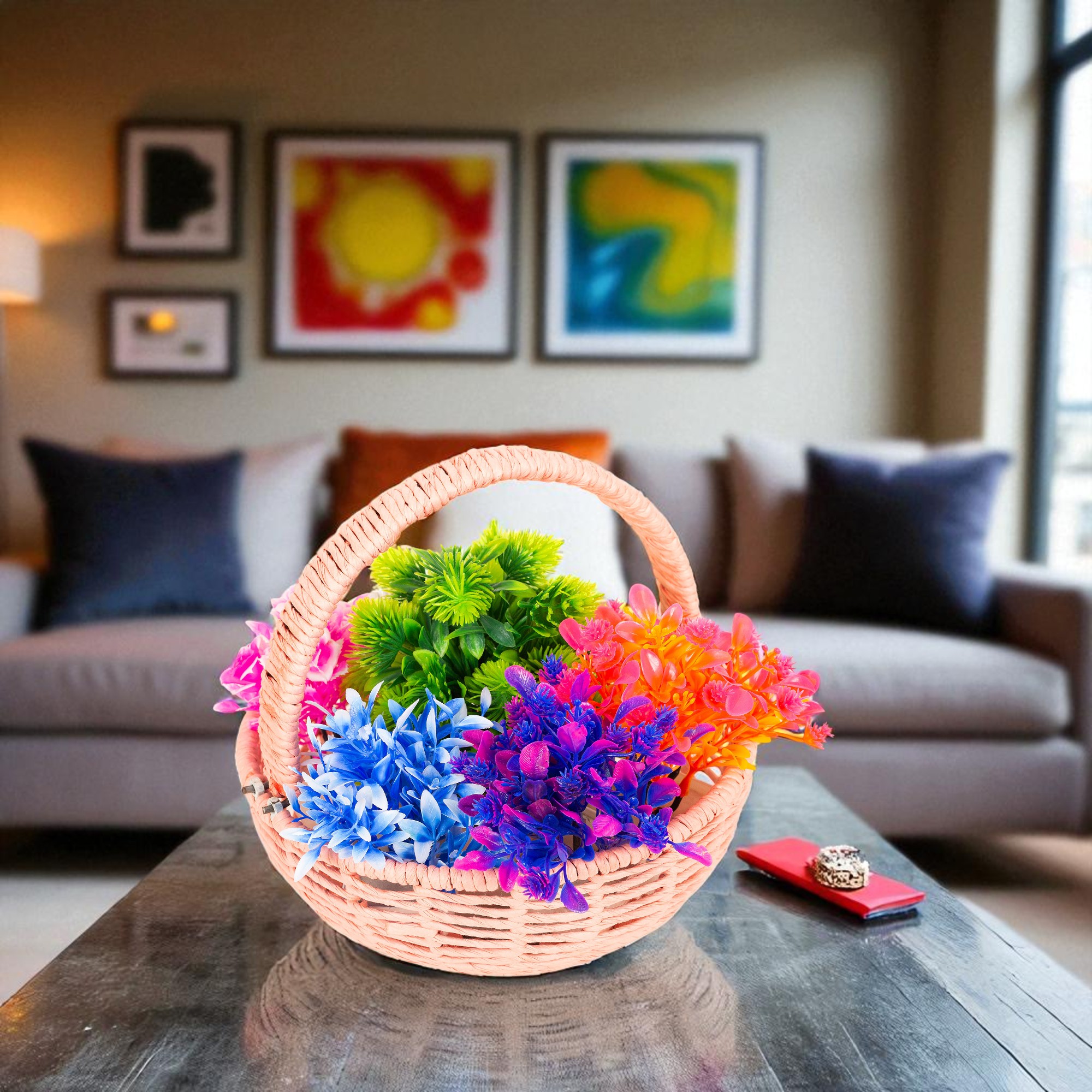 Bring home a touch of handmade charm with this raffia-wrapped basket, proudly made in India by skilled artisans. Its strong metal base and easy-to-use detachable handle make it great for fruits, pooja, gifting, or flower arrangements.