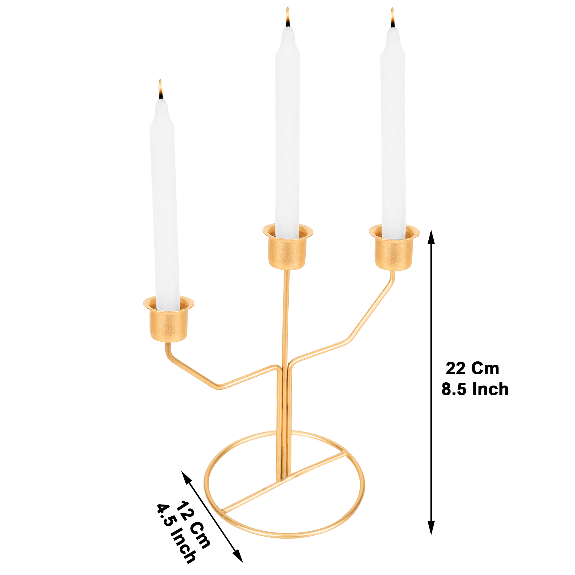 Add a touch of elegance to your space with this beautifully handcrafted designer metal candle stand. Finished with a durable powder-coated coating, it enhances any décor setting. Its free-standing design fits easily on tables, shelves, or corners, and 3 complimentary candles are included for instant use, making it perfect for home décor, festive arrangements, romantic dinners, and gifting.